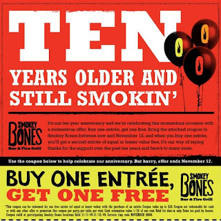 A *Hot* new Smokey Bones coupon is available: Buy one entree, get one FREE! This coupon is valid thru 11/12/09.