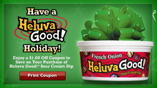 Heluva Good! just released a new high value coupon! Head on over to their Facebook page and click on the “Holiday Coupon” tab to print a coupon valid for $1/1 Heluva Good! Sour Cream dip! This is only available to the first 25,000, so get to printin’!
