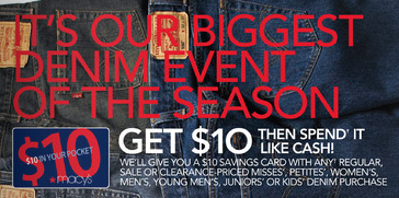 Through February 21st, Macy’s is once again hosting the “Biggest Denim Event of the Season” sale. Here’s how it works…. For ANY denim purchase that you make in misses, petites, women’s, men’s, young men’s, juniors or kid’s denim departments, you will get a $10 Savings Card at the register. You can then redeem each savings card through 3/3/2011 on your next sale or clearance purchase in ALL apparel departments including shoes and accessories (some exclusions do apply). You can see all the details in their weekly ad (page 27).