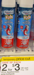 There is a $1.00 coupon for the Aquafresh Kids Cavity Protection Fresh n’ Fruity toothpaste on the Aquafresh website but I am not sure if the kind on markdown is that flavor.
