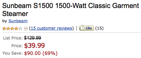 Today only, Amazon is offering up this Sunbeam 1500 Watt Garment Steamer for only $39.99 (regularly $129.99!) + FREE shipping! Plus, this product has 4 out of 5 star reviews so this seems like a pretty great bargain!