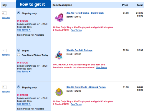Wow! If you want to snag some inexpensive Christmas gifts/stocking stuffers or want to add a few toys to your gift closet, then be sure to check out this deal on Xia-Xia toys at ToysRUs.com. Whenever you buy any of these 3 Xia-Xia playsets on clearance for $2.98-$4.98, you’ll be able to score 4 Xia-Xia Crabs AND 2 Xia-Xia Shells completely FREE (deducted at checkout)! You’ll just need to pay shipping which is around $6-$7.