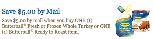 Also, don’t forget that when you purchase any one Butterball Fresh or Frozen Whole Turkey between 11/1/2012 and 12/31/2012, you can submit the rebate form found here to receive 5 $1 coupons good on any Butterball product(s). Sweet! ![]()