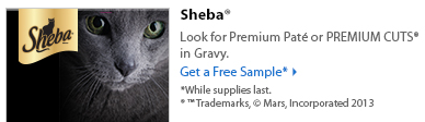 Head on over here, scroll down, look for the picture like the one below and click on the Get a Free Sample link to snag a FREE Sample of Sheba Cat Food. Allow up to 4 weeks for the sample to arrive.