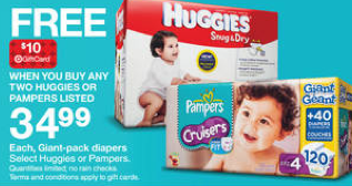 Buy 2 Huggies or Pampers Giant Pack Diapers $34.99 each = FREE $10 Target gift card