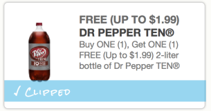 Hurry on over to Coupons.com to print a *HOT* Buy 1 Dr. Pepper TEN 2-liter, get 1 FREE (up to $1.99 value) coupon! Use zip code 62946 if you don’t see it – first click here and change your zip code to 62946, click on the blue arrow and then click back on this link and the coupon should show up already clipped. Act fast – this coupon won’t last long!