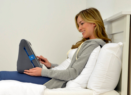 Revolutionary slim iPad case with built-in multi-stand system which elevates iPad to eye level; includes kickstand for additional stability and elastic strap to secure iPad case when not in use