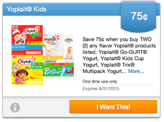 Also, this high value coupon will pair nicely with the $0.75/2 any flavor Yoplait products listed: Yoplait Go-GURT Yogurt, Yoplait Kids Cup Yogurt, Yoplait Trix Multipack Yogurt, Yoplait Pro-Force Multipack, Yoplait Baby Saving Star offer – valid through 8/31!