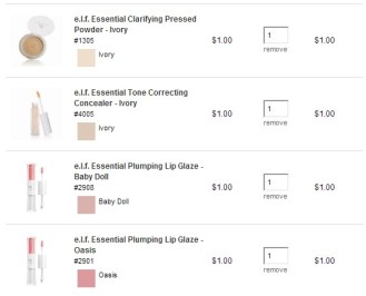 elf’s makeup is kind of hit or miss, but they do have some good stuff. The “studio” makeup brushes (the $3 ones) are decent for the price. I would stay away from the $1 eyeshadows because I’ve found them to be sort of chalky, but the $3 “baked” eyeshadows are decent. The baked blush is also good. A few things I can think of off the top of my head from the $1 range: The various applicators (always need those), the clear mascara (makes a good topcoat over regular mascara), the “zit zapper” stick, the blotting papers, the lip glosses in the squeezy tubes (not the ones with the wands), and the Shimmering Facial Whip (white makes a good highlighter). I also really like the $2 jumbo lip gloss crayons. These are just my opinions of course!