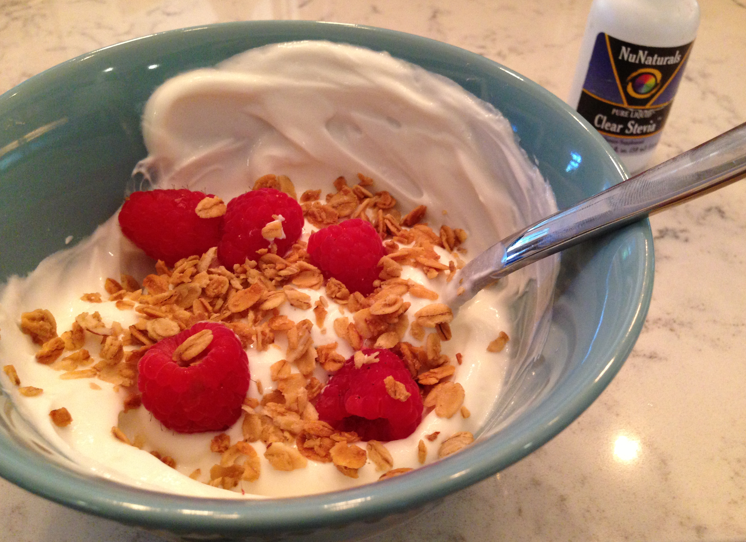 I mix in a few drops of stevia, a handful of granola, and some berries for a yummy afternoon stack.