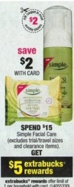Spend $15 on Simple facial care (excludes trial/travel) $2 off = $5 Ecb (limit 1)