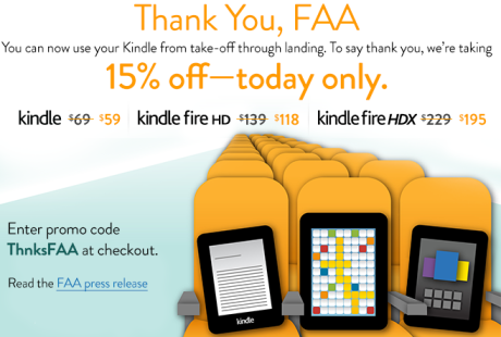 WooHoo! To celebrate FAA’s recent press release stating we can now use our Kindle devices from take-off through landing, Amazon is offering up a special discount! Today only, you can get an extra 15% off all versions of Kindle, Kindle Fire HD 7″, and Kindle Fire HDX 7″ that are sold and shipped by Amazon Digital Services – just use promo code ThnksFAA at checkout. Awesome!