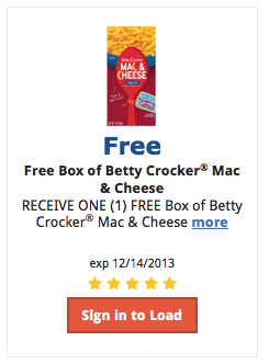 Calling all you Kroger & affiliate shoppers! Hurry on over here and sign-in to your account to load an eCoupon valid for one FREE box of Betty Crocker Mac & Cheese to your Kroger Card! Keep in mind that this offer is valid to load today, 11/29 only, but the eCoupon doesn’t expire until 12/14/13.