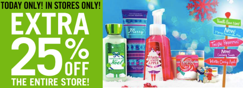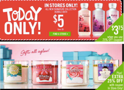 Will you be out and about doing some final Christmas shopping today? If so, you may want to make plans to swing by your local Bath & Body Works store. Today only, you can snag an extra 25% off the ENTIRE store (including sale and regularly priced merchandise!) when you print the coupon found here. This coupon makes for some great deals like 3 Wick Candles for just $8.25 each when you buy 2, Signature Collection Bubble Bath just $3.75 (regularly $14!) and more!