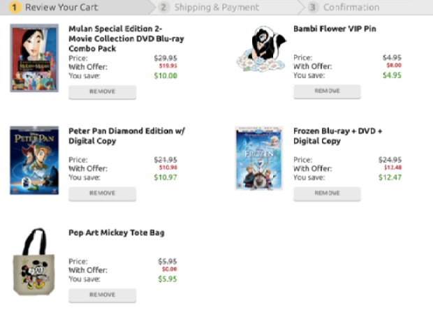 I just tried to do this same order and it only gives me Frozen and Mulan II at 50% off. The details say you have to buy one dvd or blue ray at $29.95 or higher to get addition movies at 50% off… Am I doing something wrong that my Peter Pan is still full price?
