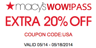 If you’re planning to do some shopping in the next couple of days, then you may want to take advantage of Macy’s new 20% off sale and clearance apparel for him, her, and kids AND 15% OFF sale and clearance watches, fine & fashion jewelry, coats, suits, dresses, Impulse, intimates, swim for her; men’s suit separates & sport coats and select shoes & home items coupon – valid to use starting today, May 14th through May 18th.