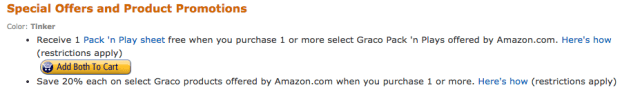 AND for a limited time, purchase this Pack ‘n Play and you’ll also snag a FREE Pack ‘n Play sheet. Simply scroll down this page until you see the Special Offers section (as pictured above) and then click the Add Both to Cart Button. The 20% discount and free sheet offer will both automatically apply at checkout.
