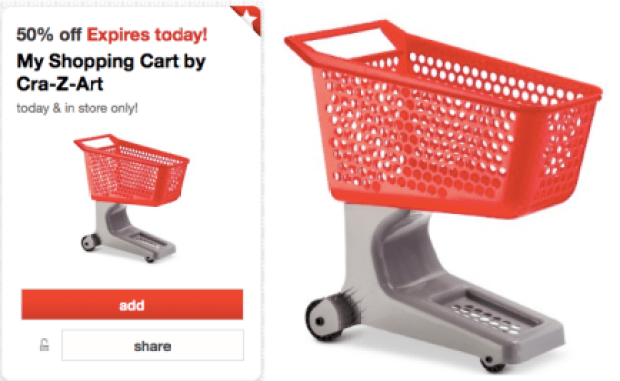 Attention Target Shoppers! Today only, save 50% off My Shopping Cart by Cra-Z-Art with the new Cartwheel Offer available here – note that you may need to log into your Target Cartwheel account first in order to view the offer! Keep in mind that this offer is valid on item# 086-00-0777 and has a limit of one and excludes other toy shopping carts – item availability varies by store.