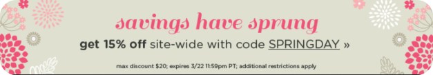 Through March 22nd, head on over here where they are offering up an extra 15% off your entire purchase ($20 max discount) with the promo code SPRINGDAY at checkout! LivingSocial always offers great local deals for massage sessions, restaurant outings, fitness activities, and more so be sure to browse around.