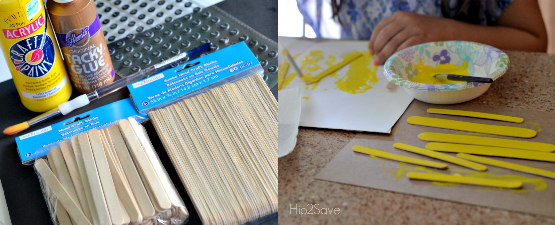 - For each bus, you’ll need 3 jumbo sticks and 5 skinny sticks. Paint all sticks yellow and let dry. Cut about an inch off of 4 of the skinny wood sticks. Arrange the 4 short skinny sticks so they are evenly spaced vertically. Glue the longer uncut skinny stick across the top of the other four. Glue the jumbo sticks across the bottom of the skinny sticks as shown in the photo above.