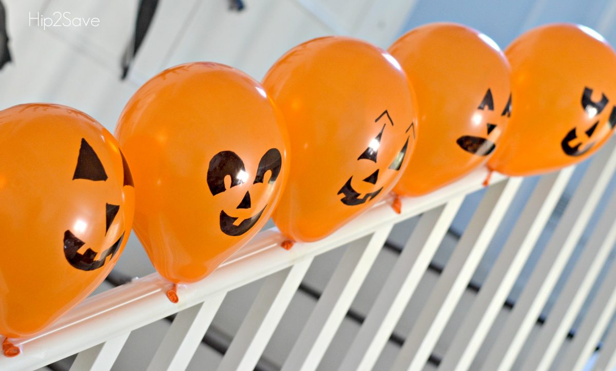 Draw Jack-O-Lantern faces using a black Sharpie marker on orange latex balloons to display anywhere in your house for an instant pop of Halloween fun! I found orange balloons at my local dollar store and used transparent tape to secure them.