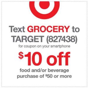 And, don’t forget! You can save $10 off a food and/or beverage purchase of $50 or more when you use the coupon found in the ad! You should also be able to find this coupon on the Target app OR by texting GROCERY to 827438. This offer is also available online at Target.com. Please note, this offer excludes alcohol, pet food, Starbucks Cafe and Target Cafe.