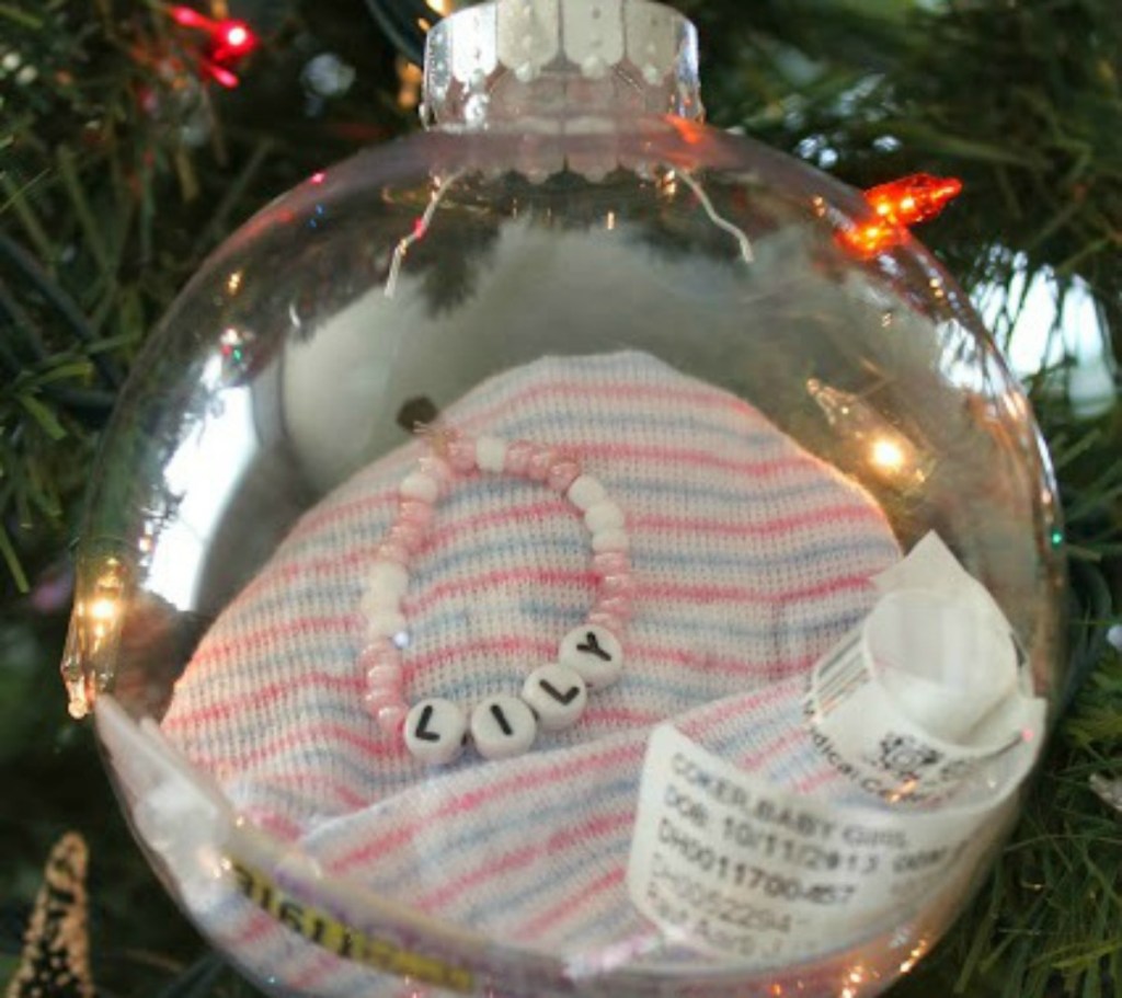 How great is this keepsake with a baby’s cap and hospital bracelet?! Such an adorable idea to display a memory of the day your child was born! You’ll have this ornament for years to come!