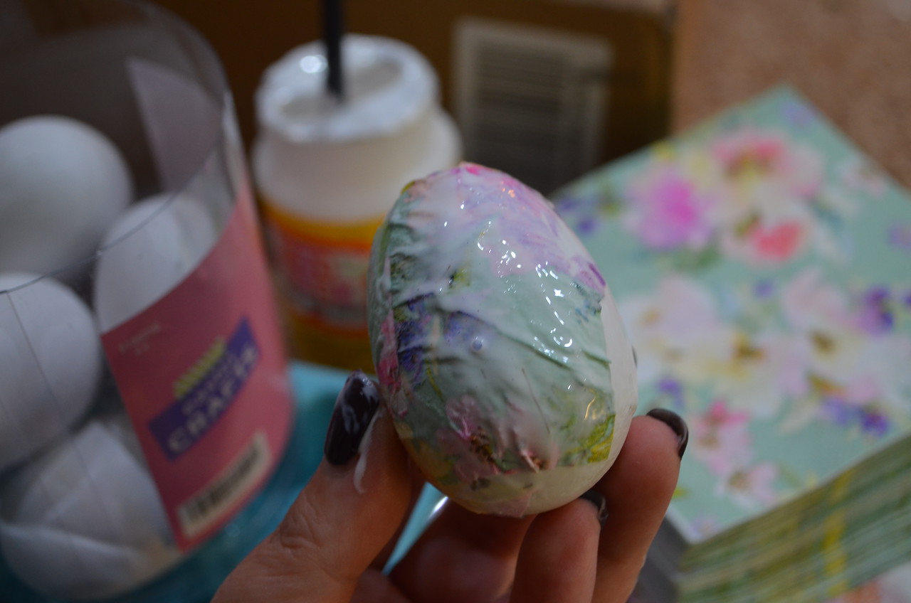 Apply Mod Podge to the egg using a paintbrush. Place a strip of paper and use your fingers to flatten and apply paper to the egg. You can also cut out certain details of the napkin to decoupage on your egg for a different design. I did this with some butterflies from the napkins I found!