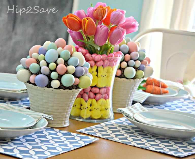 Speaking of Easter decor, check out my cute centerpiece I just put together using an inexpensive Walmart planter and my decoupage Easter eggs!