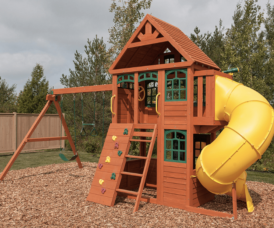 This play set has a twist ‘n ride tube slide, grand wave slide and the clubhouse that features a telescope and turning steering wheel. It has a large upper and lower clubhouse, cafe table with movable bench, dual rock wall and ladder.