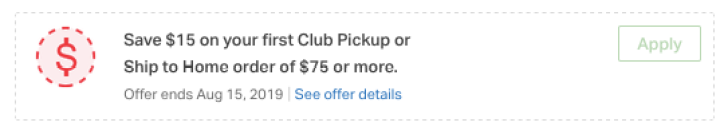 - Look for the “Save $15 on your first Club Pickup or Ship to Home order of $75 or more” banner (like the one pictured above) and click the Apply button