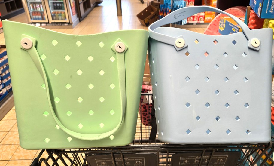 Perfect for summer, these bags have handles that swivel down, sturdy sides, a treaded bottom, and diamond holes on the sides. These are great for taking to the beach, the pool, and more.