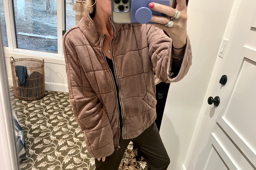The quilted pattern gives this jacket a very slight puff (like a real quilt) for cozy, blanket-like warmth, but is loose enough, with almost ‘oversized’ sleeves, that it’s still breathable so you’re not sweating.