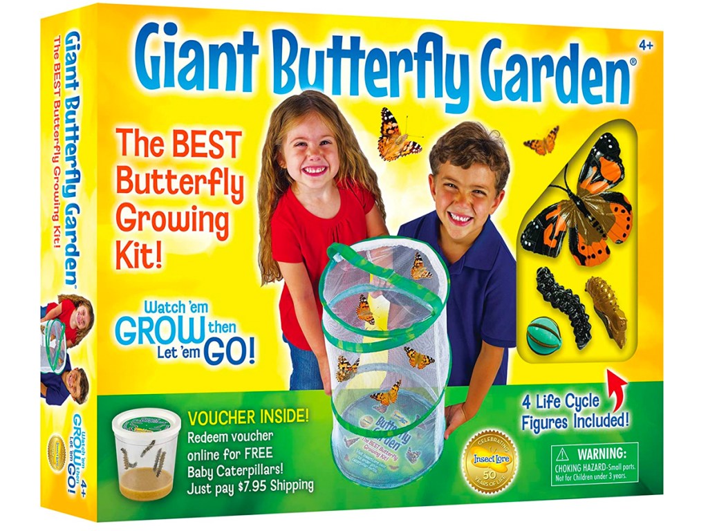 This butterfly garden kit includes a voucher for caterpillars, a reusable 18″ mesh butterfly habitat, feeding dropper, and realistic figurines representing each of the four life cycle stages! Your kids will totally love observing and recording all they see as these fuzzy caterpillars become Painted Lady Butterflies!