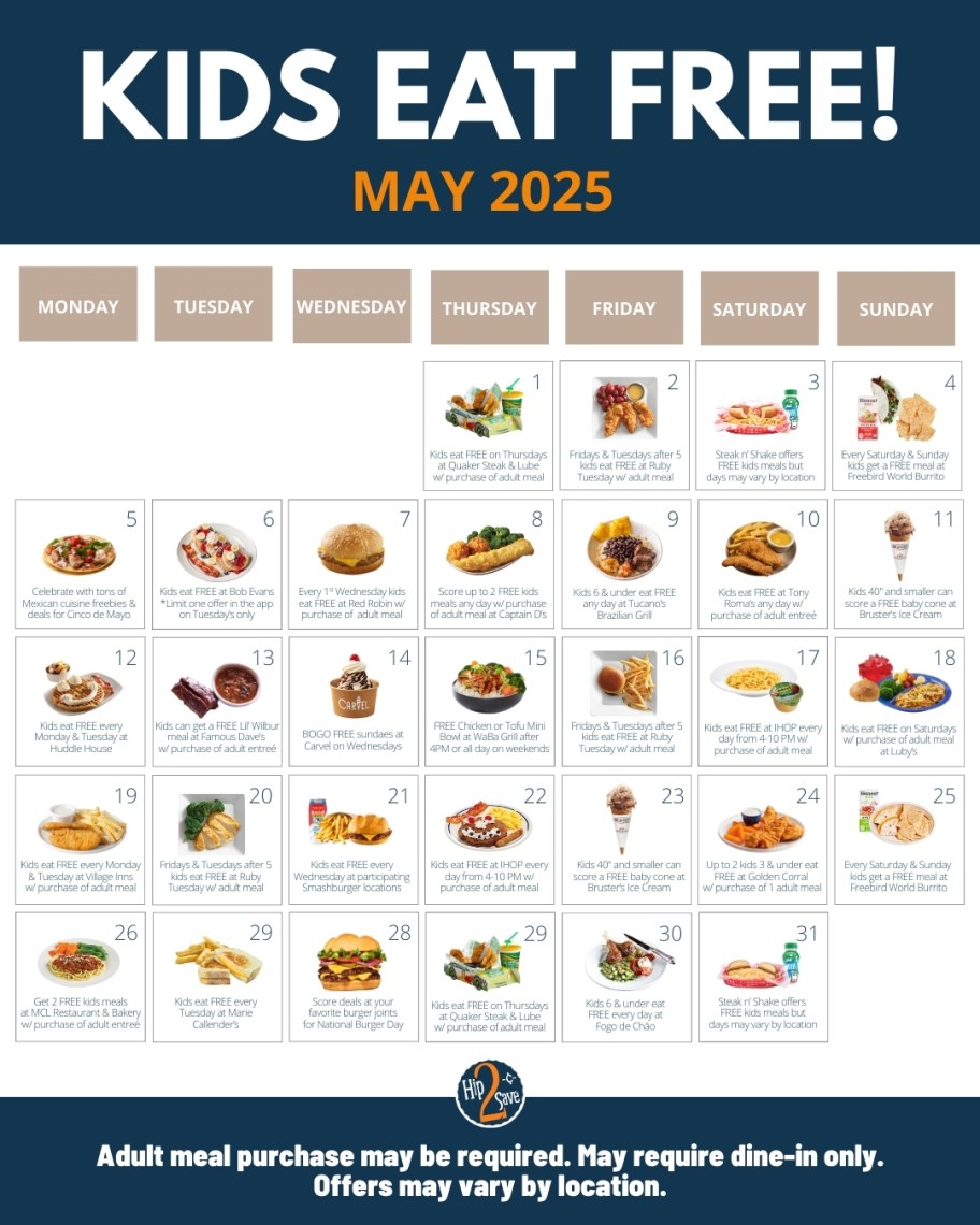 This one looks like it’s location-specific, with some Steak n’ Shake locations offering free kids’ meals any day, and others offering this deal only on select days. We were able to confirm with our location that they do offer a free kids’ meal with every $9 spent, but only on Saturdays. It’s best to check with your local restaurant to confirm the promo.