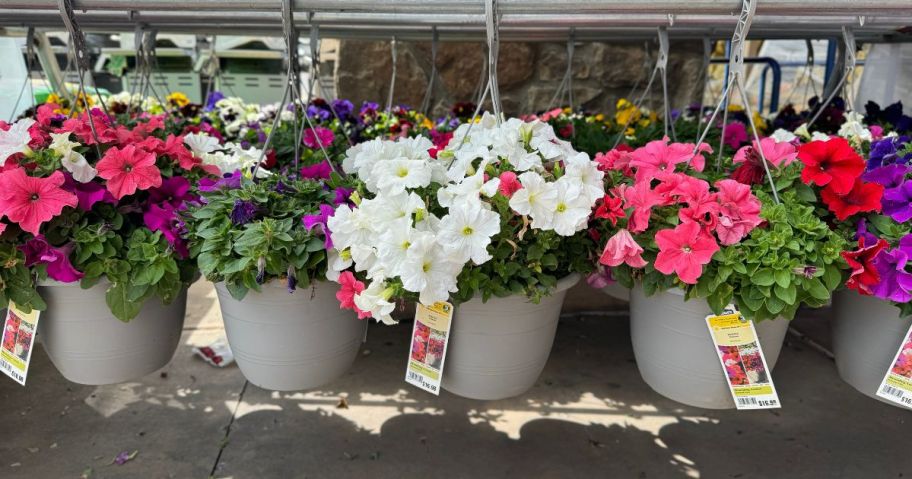 hanging petunia baskets at Lowe's