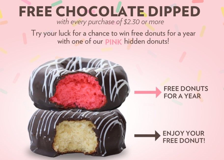 On National Donut Day 2025, you could score a FREE Chocolate Dipped Donut with any purchase of $2.30 or more from Stan’s Donuts and Coffee. A few of these donuts were pink on the inside, and if you got one of those, you won FREE donuts for a year! 😍