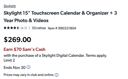 For the skylight calendar, I am not seeing the $70 sams club cash back marked anywhere on the product page or mentioned in my cart. Is there a way to find more details in that?