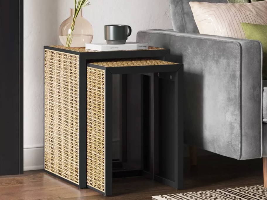 light brown Threshold Woven Arched Wood Cabinet in living room