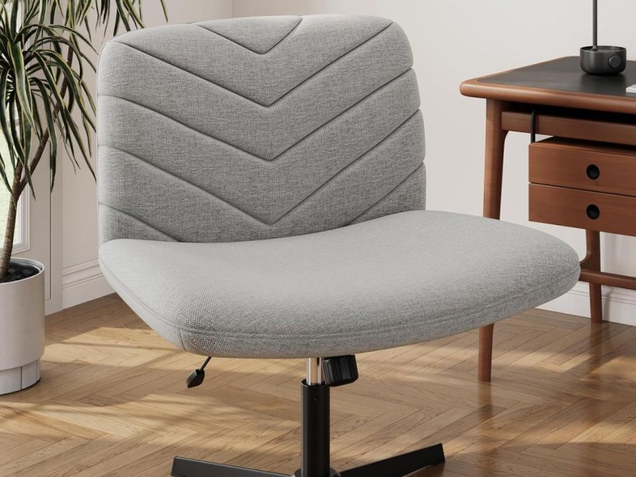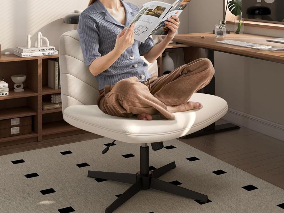 This comfy, cross-legged-friendly chair features a 26″ extra-wide seat and an armless design, so you can sit however you like—crisscross, legs up, or one leg propped. It’s got a sturdy X-shaped iron base, adjustable seat height (16″–20″), swivel motion, and a tilt function for lumbar relief. A great fit for small spaces, vanity setups, or work-from-home corners!
