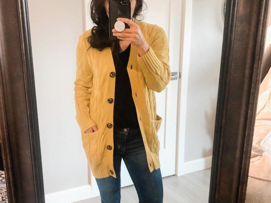 This sweater is so soft. I love the length which falls about the upper hip level depending on height. It’s not too long and not too short. I also love the side slit which allows it to hang great. I wish they had more colors and it was a fantastic price!