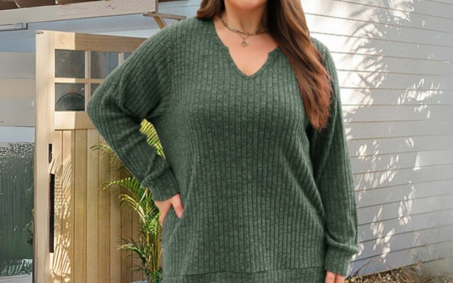 This cozy knit sweater would be a perfect match for jeans or skirts and a great layering piece. It’s available in tons of color options and sizes from S to XXL.