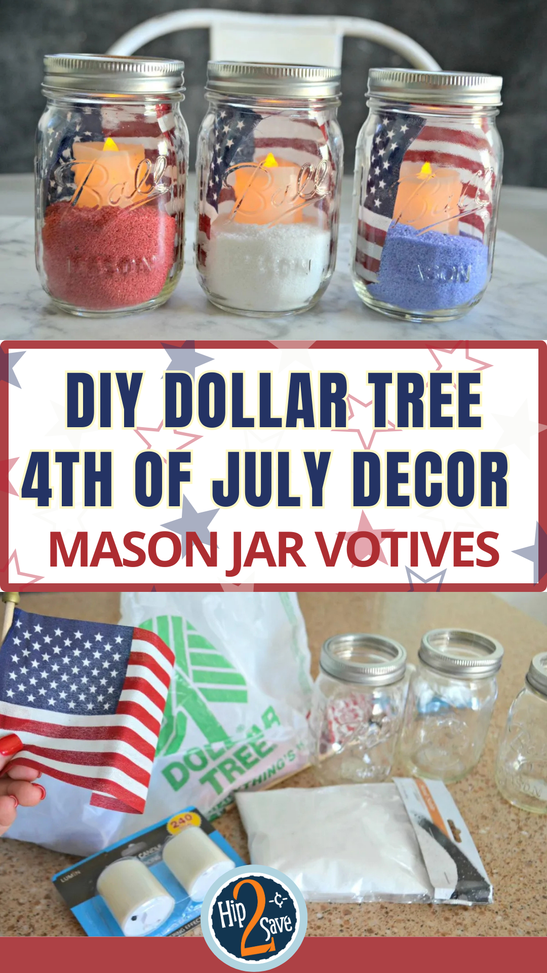 These American flag Mason jar votives will brighten up your home or patio! Better yet, Dollar Tree has the majority of the craft supplies you’ll need for a frugal, simple craft anyone can do!