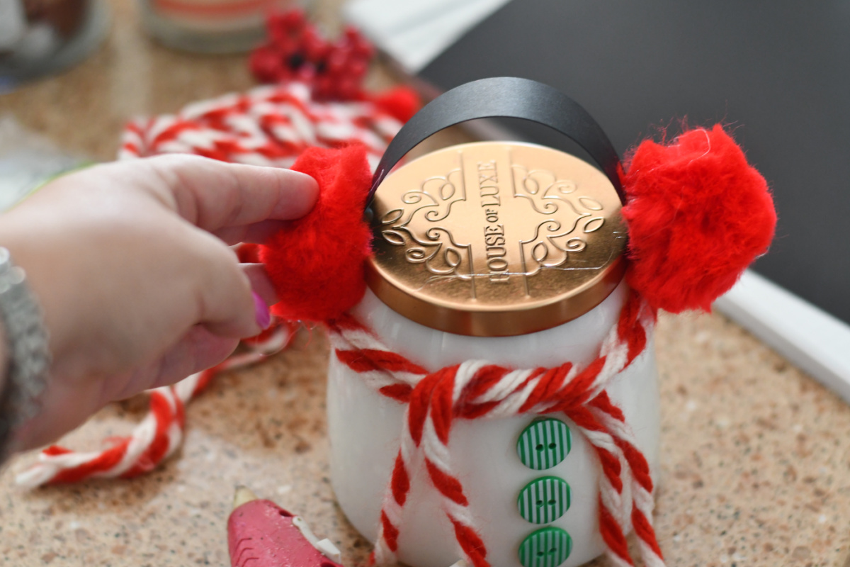 - Glue jumbo craft poms to both ends of a strip of cardstock paper and then glue it to the lid sides of the candle as “earmuffs”.