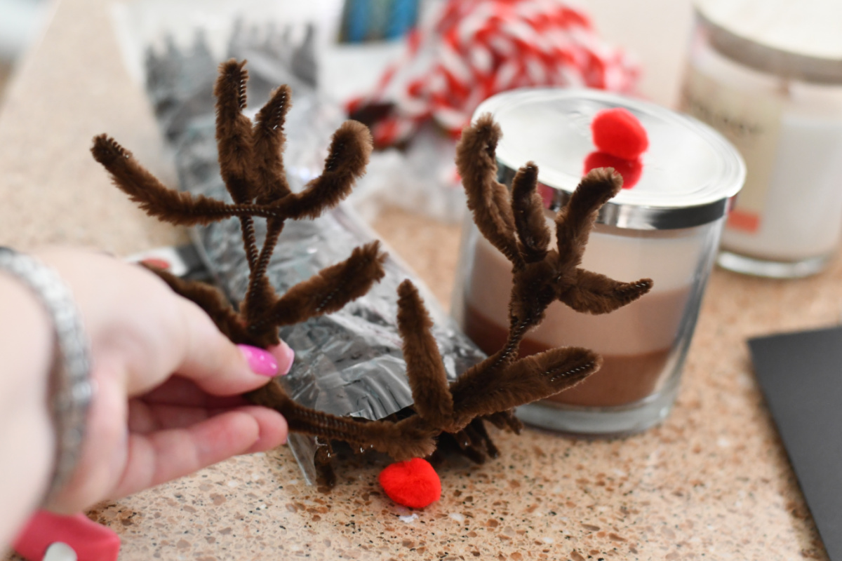 - Arrange a few brown chenille stems (or pipe cleaners) into an antler shape. Hot glue or tape them to the top of the candle.