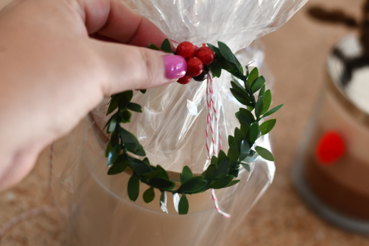 - Tie yarn, ribbon, or fabric strips around the candle as a “scarf”. P.S. My candy cane yarn is a Marshall’s find!