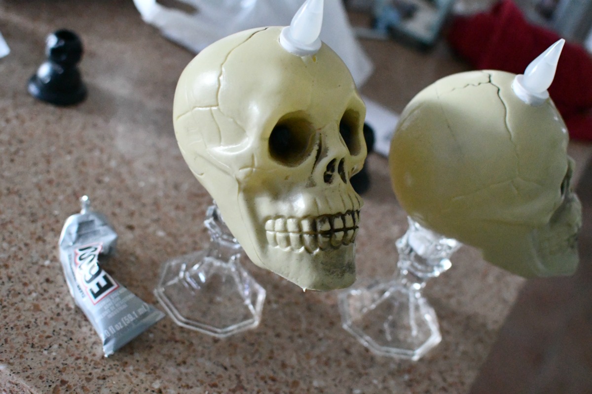 Basically, we are just cutting or drilling a circle at the top and bottom of these plastic skulls, and then putting them over the candles. Then you’ll glue it together, and finally spray paint them, so all three parts look like one piece.