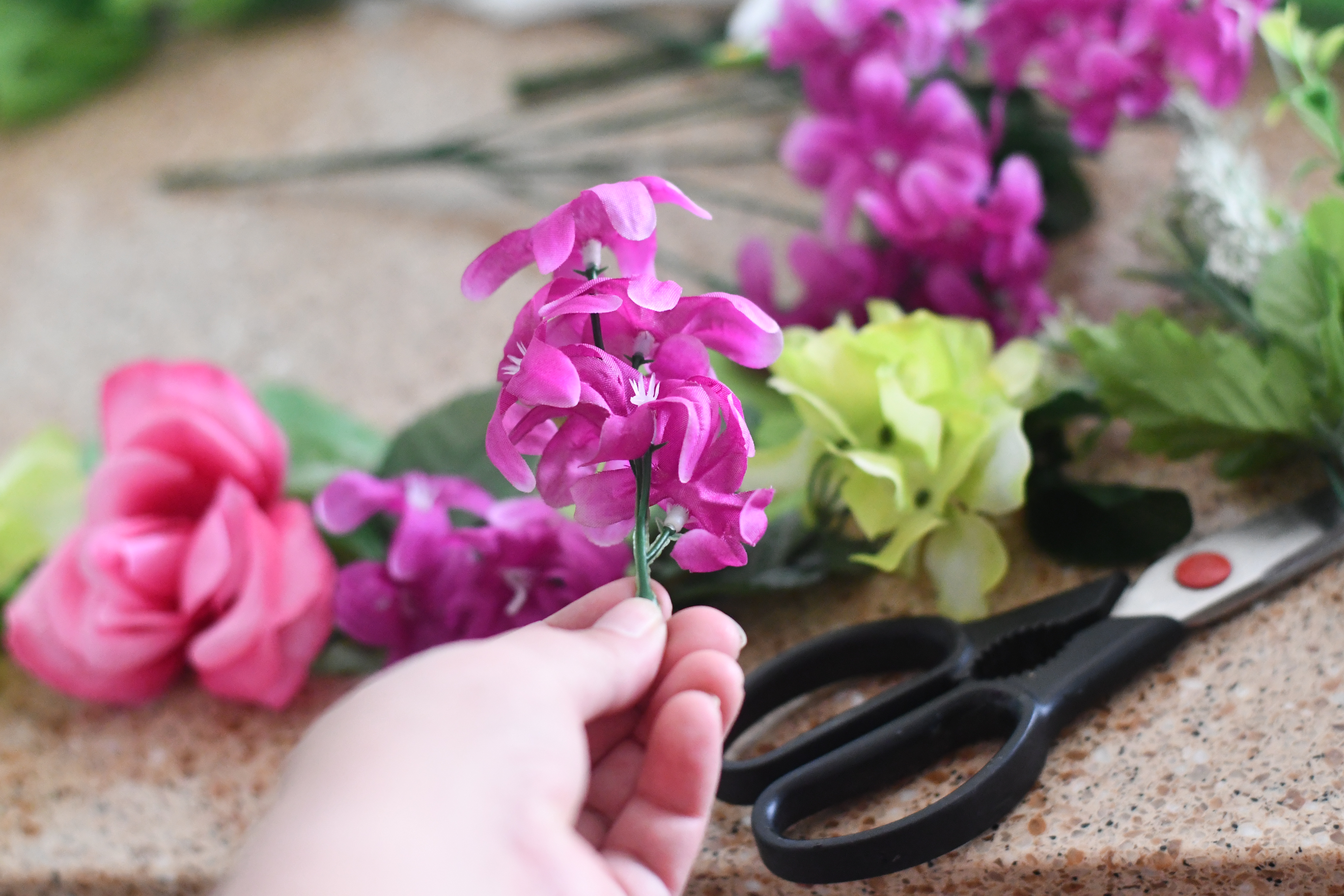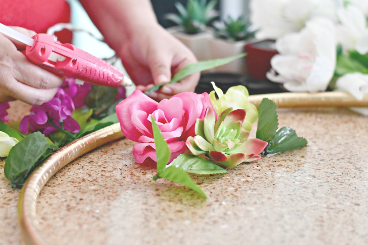 After spraying the hula hoop gold and letting it dry, start pulling apart and deconstructing the faux flowers and greenery. This is the key to making them look like an arrangement. You can come up with any style or pattern, as there’s no right or wrong here. You’ll notice I created one longer arrangement and one shorter on the diagonal, mixing individual flowers, leaves, and succulents.