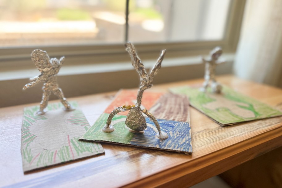 Aluminum foil is so bendable and easy for little hands to shape into fun sculptures! Encourage kiddos to think of their favorite activity (swimming, playing soccer, basketball, etc.) and display those actions.