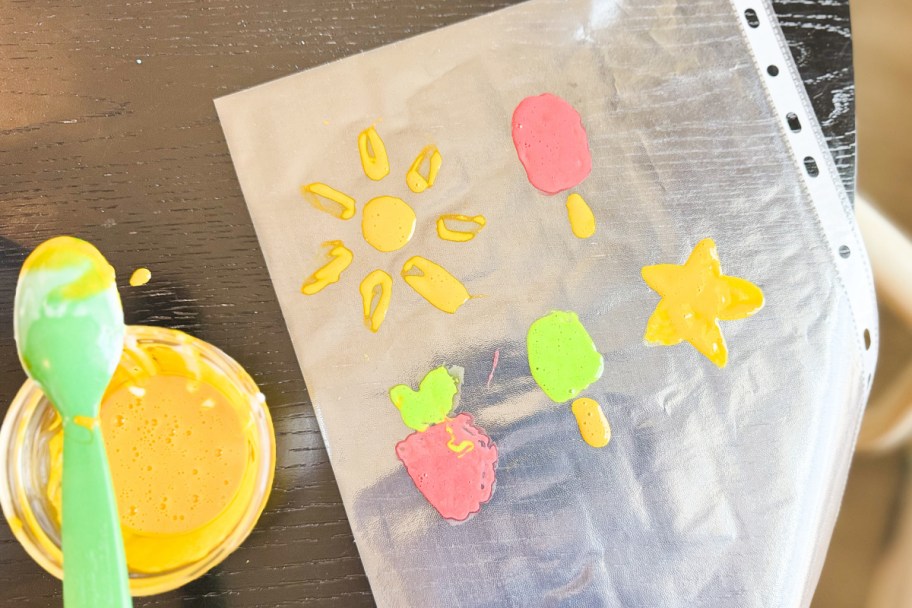 Repeat the recipe above for each color desired. Paint fun shapes on the sheet protectors and let them dry overnight. The following day, gently peel the shapes from the sheet protectors and stick them onto windows – it really works!